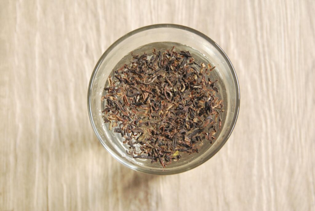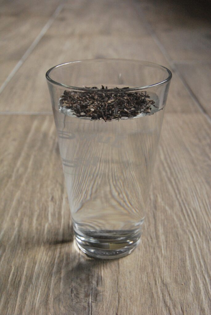 Hier einmal die unbeteete Tasse und die Menge an Tee den ich aufgestreut habe. Es handelt sich hierbei um einen schwarzen Darjeeling, also einen Indischen Schwarztee