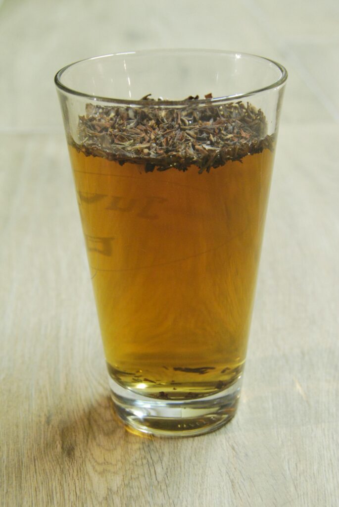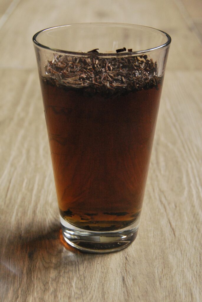 Geschmacklich war der Tee ähnlich einem zu lang gezogenen heißen Teeaufguss etwas auf der herben Seite, aber bei weitem nicht so stark wie man es aufgrund der Farbe vermuten würde. Ich möchte auf jeden Fall weiter damit experimentieren, ob Tee durch langes Ziehen und vielleicht die Beigabe von Hefe oder anderen Stoffen von selbst eine gewisse Süße entwickelt. Die Blätter im Beutel sind ja schon ein Produkt von Fermentation oder zumindest anfermentiert.