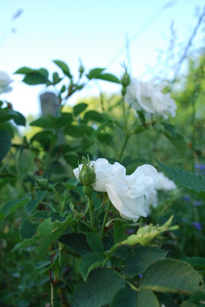 Vor zwei Tagen saß ich abends draußen im Garten und betrachtete eine weiße Alba Rose die noch nicht all zu lange hier ist. Sie ist ein Ableger eines Rosenstockes meiner Ururgroßmutter die ich zwar nie persönlich kennen gelernt habe, aber die eine innige Verbindung mit Pflanzen gehabt haben soll und sowohl mir als auch meiner Mutter sympathisch im Kopf geblieben ist.